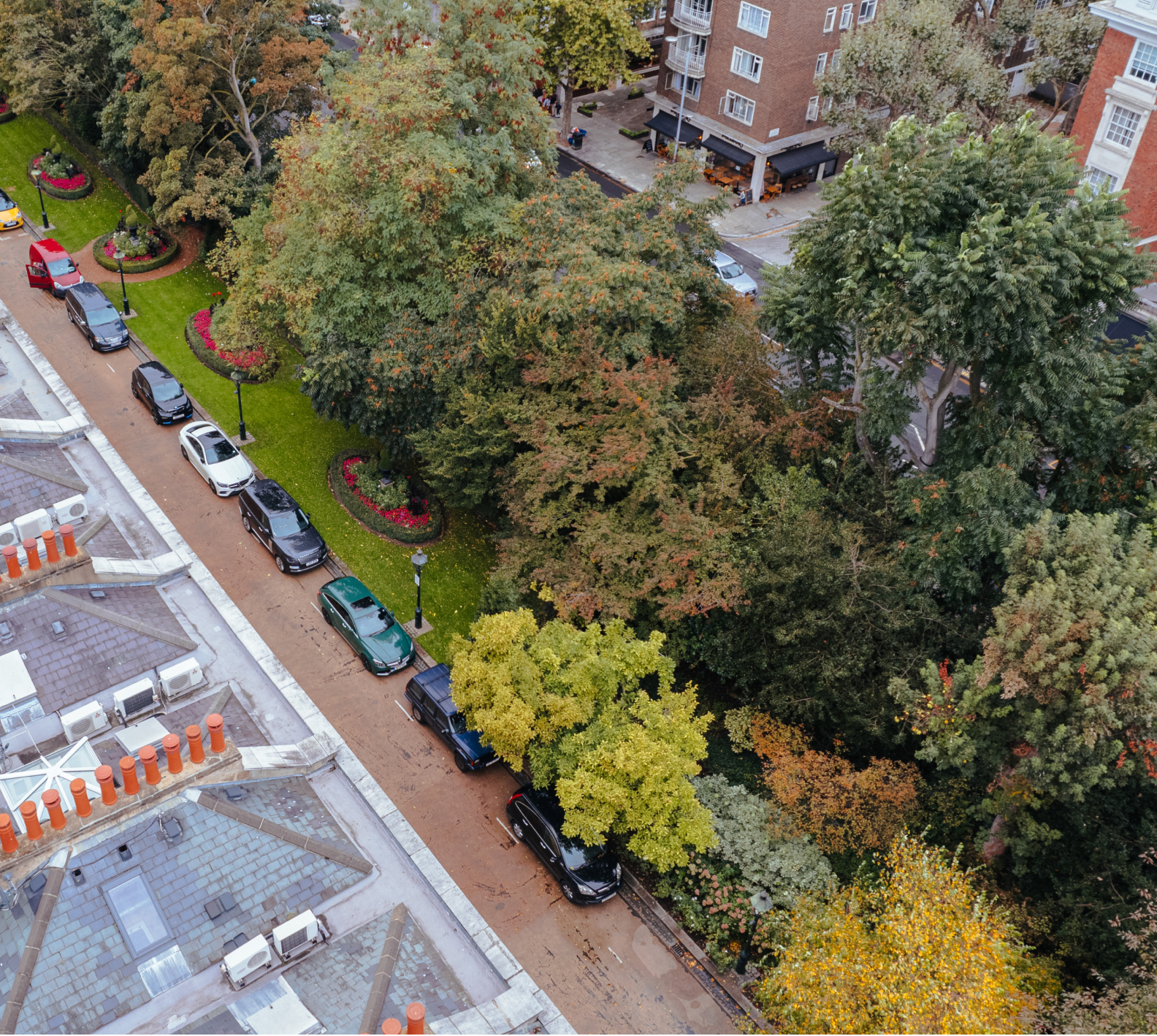 The private formal front garden is part of Edwardes Square Garden and features colourful flower beds and picturesque views on a half acre plot. The tree lined garden offers noise and light protection from Kensington High Street and enhances the privacy for residents. With green views out most windows, residents can enjoy the feeling of being surrounded by nature without leaving their home.